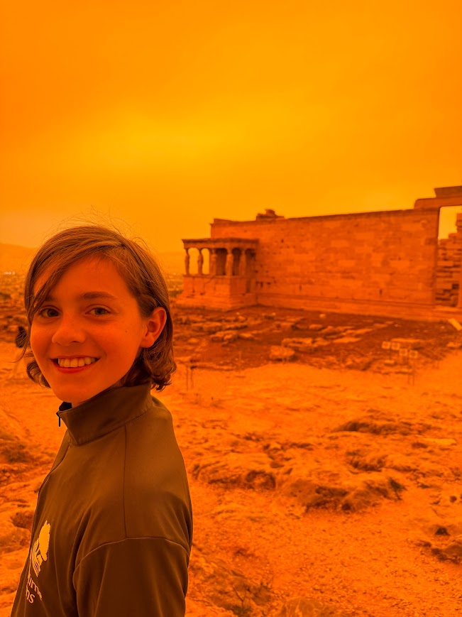 #10: (Athens, Greece) Acropolis dust storm! We chose just the right day to visit the Acropolis in Athens. That was the day that dust blew in all the way from Egypt and made the sky turn a rich orange color. James and I are into Greek Mythology, so we were already having fun learning about the history there, but the dust storm made it feel especially ancient and kind of magical.