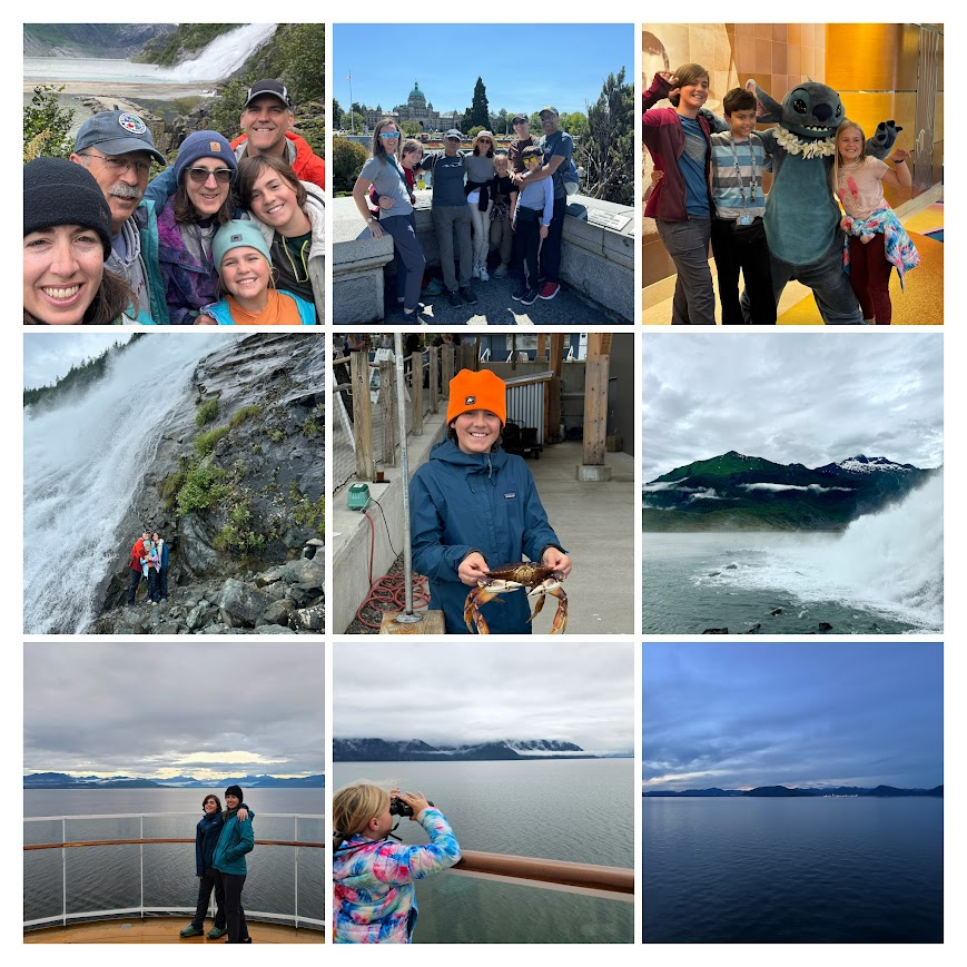 This week gave us some extra special family time as we were joined by extended family members to enjoy a cruise to Alaska. After months of nonstop planning, it was a luxury to relax and have most of the work taken off our shoulders. Being on a busy cruise was a bit of a culture shock after spending so much time on our own; still, it was a fairly seamless way to visit a number of spots we wanted to see without the usual pesky concerns about things like finding food. (Actually, the main concern about food on the boat was stopping yourself from eating too much!) We loved having the time with my parents and my sister’s family, and it was so much fun for the kids to have their cousins to play with. Alaska was beautiful, filled with incredible scenery and wildlife. We were especially excited to spot orcas, otters, bald eagles, and even a humpback whale breaching.