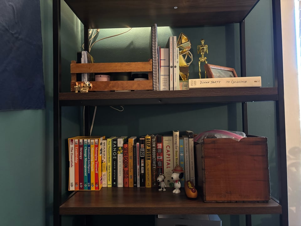 This is a bit of a sidenote: I can't decide if I'm embarrassed or not to have all these books. I return to this theme from time to time, as I think about my job and work, many of you will have spoken to me and are familiar with that. Is it cringe to want to do a good job? A little. If work were more embarrassing and I leaned in anyway, we would be in comfortable territory, irony-drenched camp, a guilty pleasure. If I didn't care at all, then that's also solid ground. I log on, I log off, who cares, the earth spins on its axis and God is in his heaven. But work at my email job is a little bit silly, and I care a significant amount, so it sticks in my head because I can't resolve it into something that makes sense.