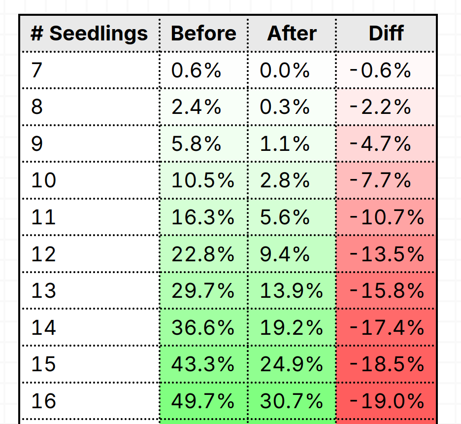 I created a Python script which simulates the number of seedlings required before and after the addition of Ice Pikmin and displayed the results in a table.