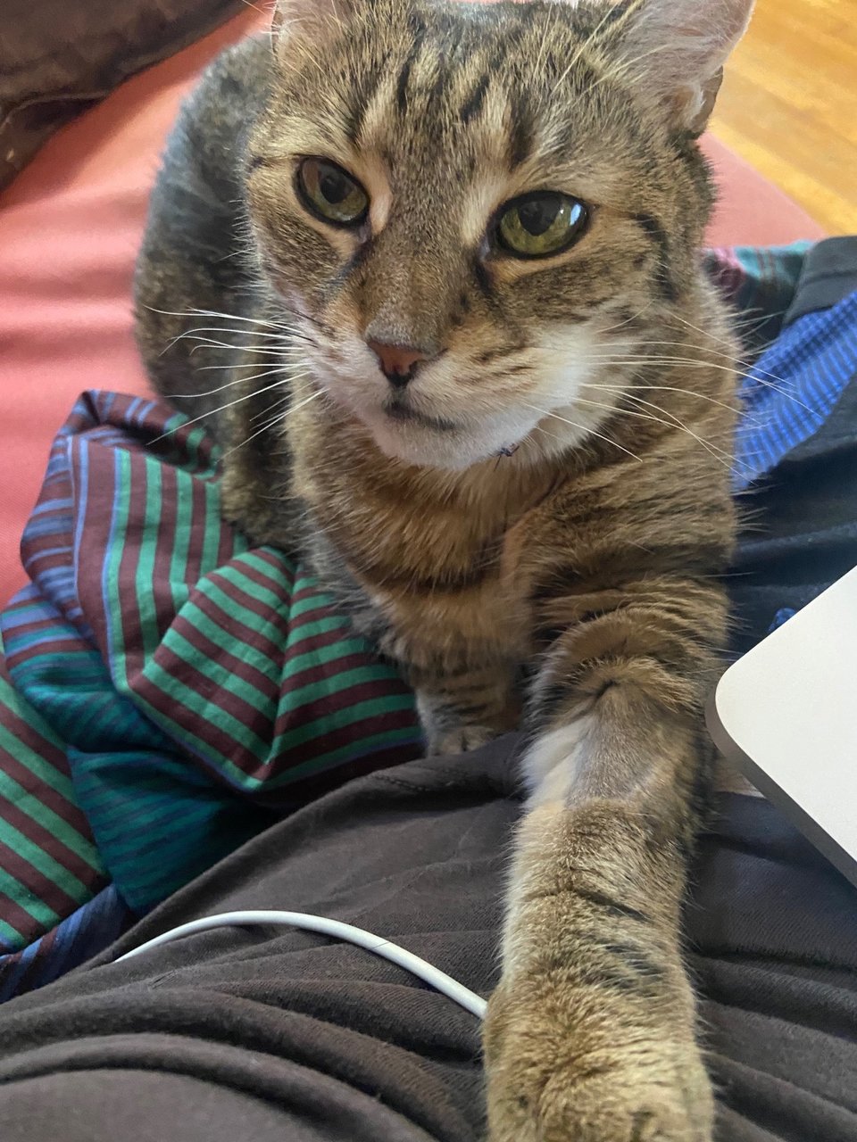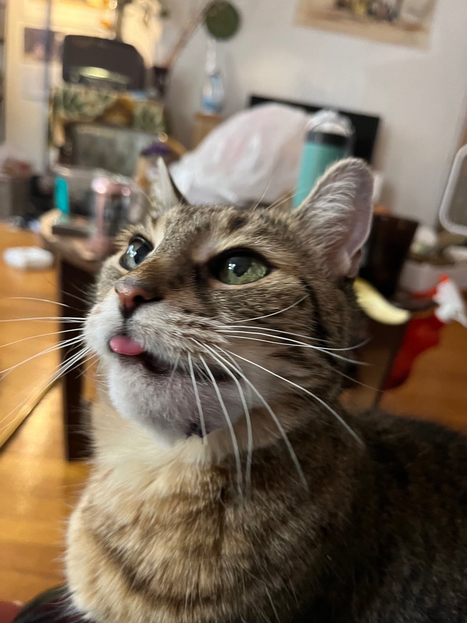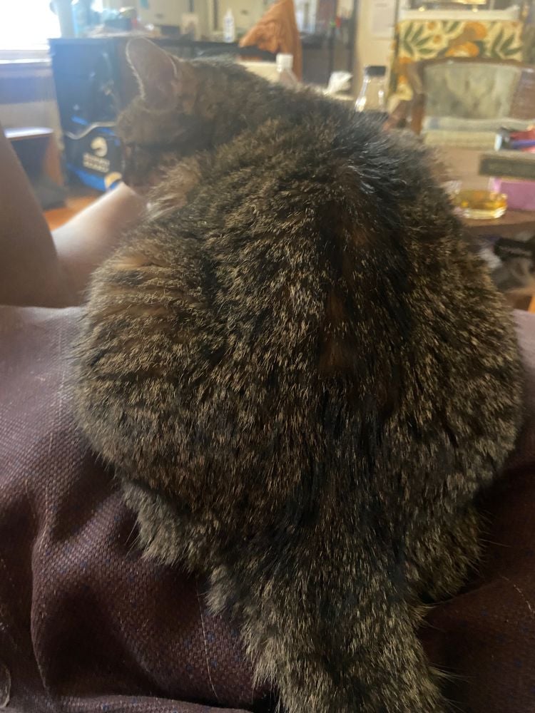 2) Sandwiches did not trust anyone easily. Growing up on the streets likely contributed to her unease and frequent mistrust of strangers, especially men. She might have bitten you if you petted her too long, even if you were rubbing one of her favorite spots (under her chin, between her shoulder blades, across her forehead atennae, and over the small of her back). Too much stimulation was definitely one factor, but her sense of trust was another. It took months for Sandwiches to stop swiping at me, even though I’ve fed her a few times a day and usually seven days a week for the last two and a half years or so. I played with her (though probably not enough), gave her lots of lap time and pettins’, scooped her poop, and let her say “Hello” to everybody I talked with on the phone or Zoom. Sandwiches eventually let enough of her guard down to sometimes lie down nearby in a half-croissant pose (belly up) to show that she trusted us (and me in particular). I also slow-blinked at her, which helped, and so did varying the different spots where I scratched her (not too long under the chin, now the attennae, now the shoulders, the chin, the other side of the neck, etc.). She still liked to fight at the end, though it was sometimes hard to understand why. As I mentioned, drinking water became difficult for her and she would take out her frustration on the various bowls, glasses, and other containers we left for her around the house. At first we thought this was business as usual since, as Jene pointed out, the cat used to bat at glasses and cups of water when she was a kitten. Later I saw that she was trying to eat by scooping at the canned food we gave her and breaking it apart on the floor. It was only around her last week when I realized that she was trying to do something similar with her water dishes, but couldn’t figure out how to drink since her lower jaw and tongue were both so badly displaced by the tumor. Jene tried to reassure me that the cat didn’t need that much water, not as long as she was eating her wet food. Sandwiches still lost weight, thanks partly to the antibiotics and pain-killers and shots that she was getting in her final months. I also couldn’t help her to drink despite many frustrated attempts. I was worried that she was rebelling against us one last time. But she did show that she trusted us in other ways. She couldn’t groom herself very well, for example, but she did let me use both cat-friendly wet wipes and dry shampoo to clean her a few times. The shampoo must have felt good on her tangled fur, though it also exposed how much of the fur between her front paws had come off after she frustratedly scratched at it. Thankfully, when I used the dry shampoo on Sandwiches, she stuck out her chin with anticipation a few times, as if to show me that she not only knew what I was doing, but was also looking forward to being cleaned. I wish that I could have done more for her.