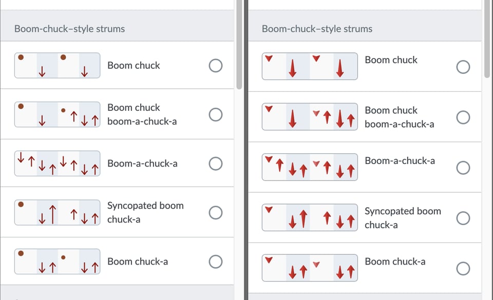 P.S. - Any feedback on these new strumming pattern diagrams? Old is on the left, new is on the right: