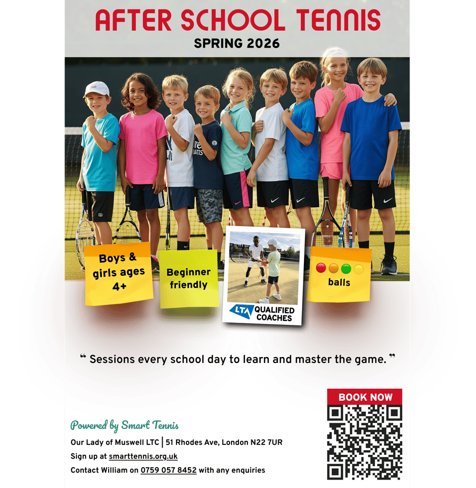 Our Spring After School Programme at Our Lady of Muswell LTC is now open for sign ups. It runs for 7 weeks, from Monday, March 2 → Friday, May 1 (excluding Easter break — there will be a camp during this period, which we will email about in February). Thanks to parents feedback, there have been small adjustments to the grouping — this should hopefully make picking the appropriate group for your child more clear. For more information, and to sign up, please go to https://smarttennis.org.uk/after_school.