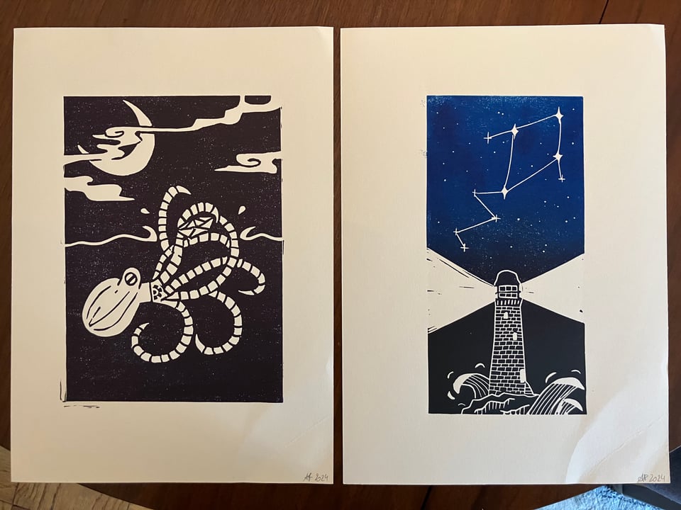 A while ago, I stumbled across some beautiful Natasha Pulley-inspired linoprints on Tumblr. When I inquired about purchasing them, the artist informed me she didn’t sell her art.