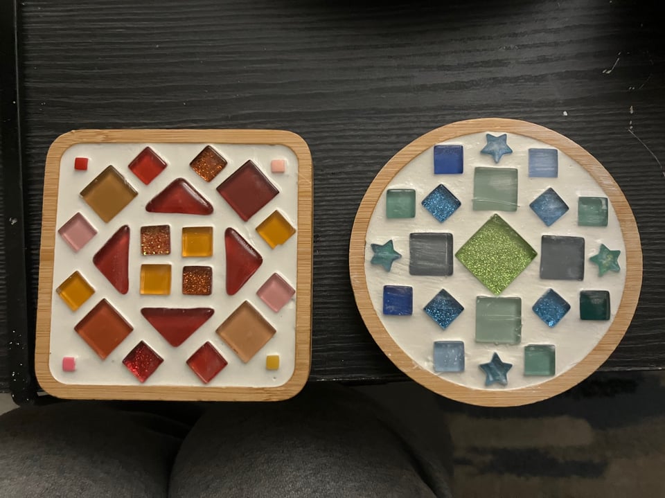 For Thanksgiving, I had a bit of a self-care day: I made mashed potatoes, put on a mediocre romcom, and dug into one of the crafting subscription boxes that have been piling up in a corner for the past year. The box I chose was the mosaic craft box. Armed with glass, glue, and a glass of moscato, I slowly assembled and grouted 2 mosaic coasters and a mosaic vase. It was a lot of fun! I don’t think I’m going to become a mosaic artist anytime soon, but I enjoyed picking out glass in coordinated colors, as well as arranging them into geometric patterns.