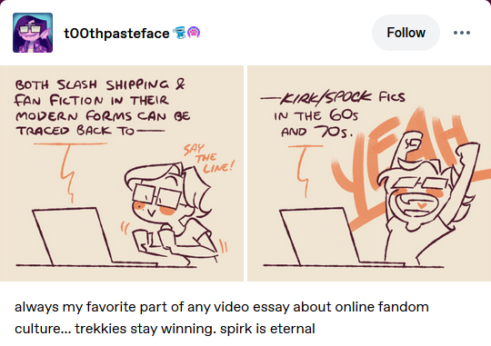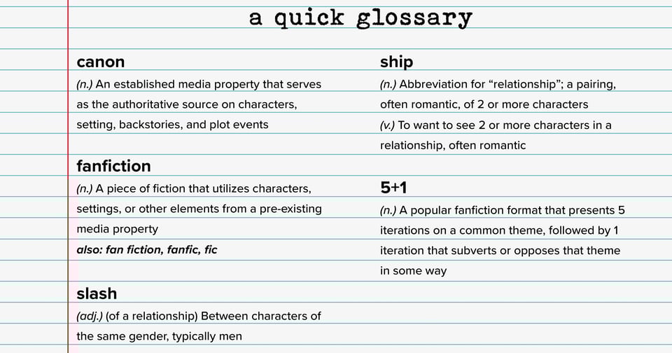 That’s right: fanfiction is something you can study. There’s the history of it, of course, tracing its modern form back to Star Trek fanfiction from the late ‘60s. There’s the queer theory underpinning the proliferation of slashfic written by women. There’s the contemporary evolution of fic—the relentless censorship that chased authors from Dreamwidth to LiveJournal to FanFiction.Net (aka FFN) and that ultimately led to the creation of the Archive of Our Own (aka AO3)2.