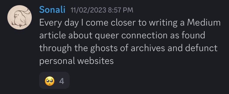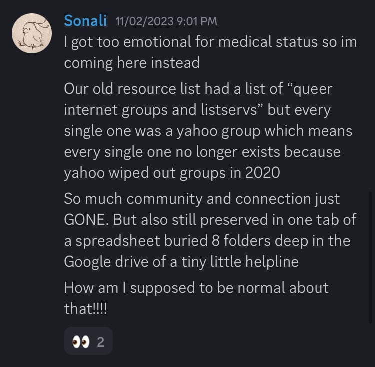 These instances took my breath away, too, this time by punching me with grief. Is it dramatic to grieve the loss of pieces of community that were born and died before I was even a sparkle in my parents’ eyes? Maybe. But how could I not ache for the erasure of so much queerness, lost forever to the digital ether? And not just queerness, but records of individual human experience and human joy?