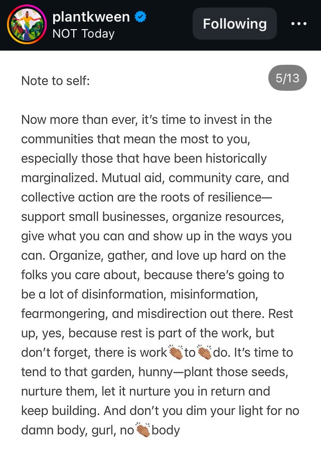We are back and we missed you! We have had some rest, we are stoked that the days are getting longer, and we hope you have been taking care of yourselves. We have assessed our capacity and we’re excited to share some new projects in the works. Community care is something we have been thinking about a lot. A LOT. We were trying to sum up some words as a snappy newsletter introduction, but then we saw that Plant Kween, aka Christopher Griffin, summed it up for us on January 20th, MLK Day.