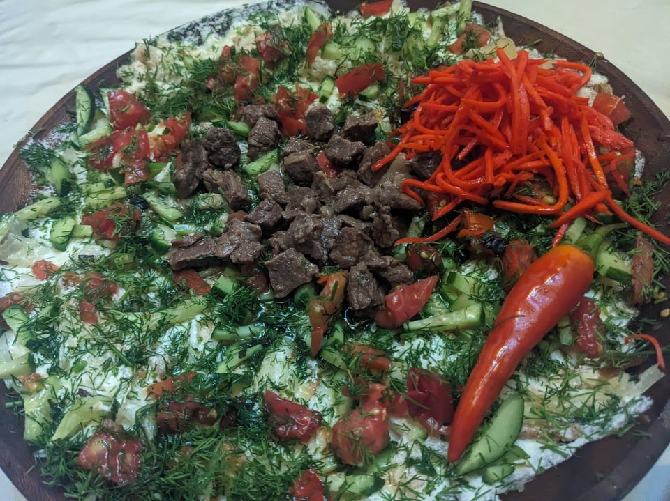 But Tajikistan’s national dish is Qurotob and is delicious. Place thin bread in a large dish, layer on meat, cooked vegetables and some salad vegies, and smother it in a kind of tangy cheesy sauce. It’s actually delicious, and much more interesting than the other two.