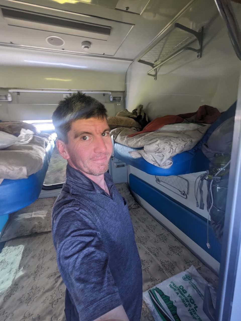 My second-class “coupé” sleeper from Khiva is a big improvement over the pleb-class sleeper from Bukhara. Long enough to stretch out, enough headroom to sit up, it’s pure comfort, and even the late night chatter and smoking from the couple on the bunks below can’t get me down.