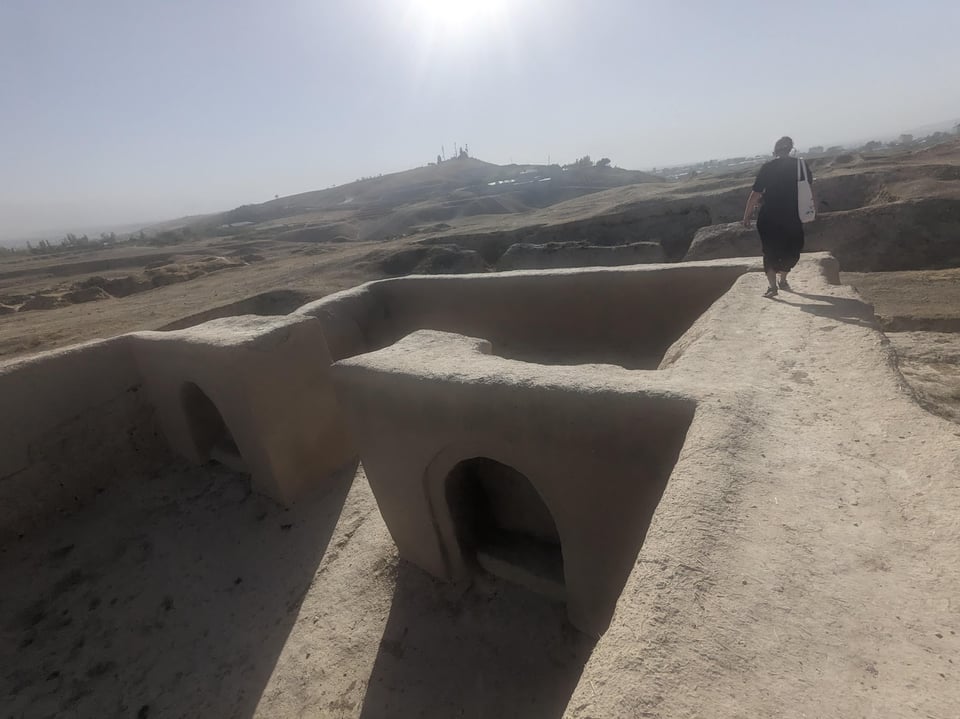 Carole, Joey and I explore Panjakent’s only real sight, an archeological dig on a hillside a short walk away. Only fractionally more interesting than the Afrosyab site in Samarkand, it has the benefit of excellent views and being free. But there’s no explanation what this site actually is, and there are some pretty dubious reconstructed buildings.