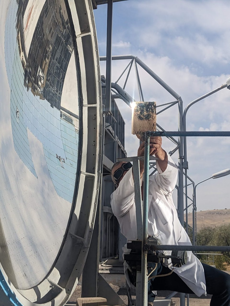 Outside we get the standard demonstration of a small-scale solar cooker, instantly setting fire to a piece of wood. They ask if anyone has some food to cook, and I offer a piece of bread. Five minutes later, it’s warm bread. Things only really get cooking when a stereotypical mad scientist arrives, complete with lab coat and dark glasses. He leads us to a much bigger concentrator, several metres across. He slowly swivels one of the large flat mirrors to face the concentrator. Then he raises a bar of metal to the sweet spot, and within half a minute, there are sparks flying and a glowing red hole is burnt into it.