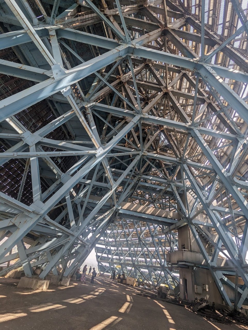 Finally, we go inside, to climb up to a viewing platform at the very top. Inside, it is a huge assembly of interlocking steel trusses, beautiful in its own way, and well frequented by a local pigeon population. This structure is also being renovated in some way, and there are workers and equipment all about, although nothing much is happening right now.