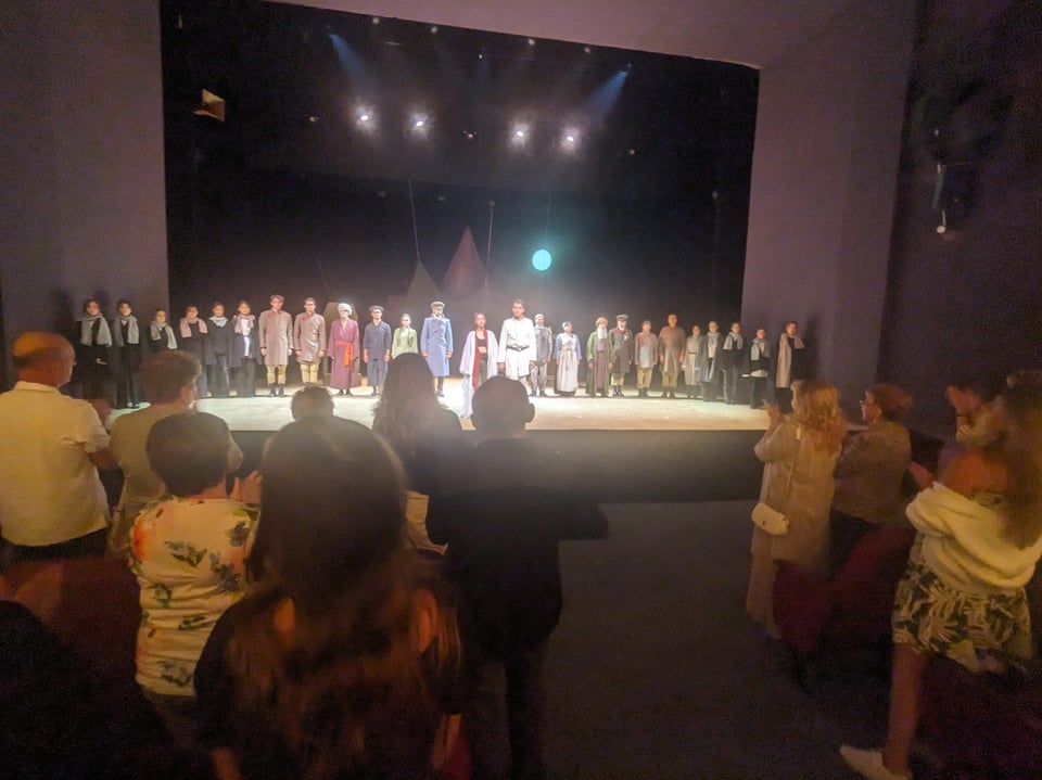 Then there is a very awkward and slow transition to the bows and applause bit. The prince rises to his feet - is he a ghost, or is the play over? The princess joins him. They stand grimly on stage with sombre music, and no one is sure if the play is still going. A half hearted applause dies out. A few more actors come and join them, and eventually everyone decides this is definitely applause time. Now the actors are bowing, but the music is still sad, and the actors are all stony-faced. The whole cast is now on stage, and taking turns bowing. No smiles. The audience drifts in and out of synchronised clapping, and begins a listless standing ovation. A couple of audience members give gifts to the middle-aged maid actor. It’s all a bit weird.