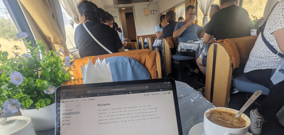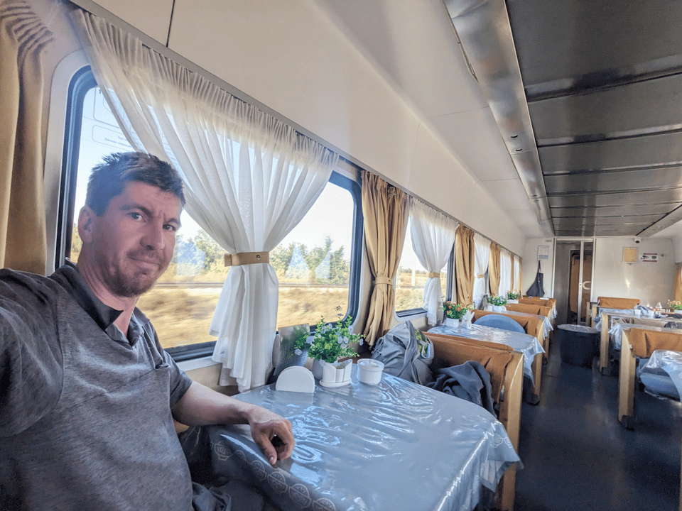 In all the chaos, my dinner order has been forgotten, a situation my new friends help resolve. Beef stroganoff while bouncing through the Kazakh steppes is a pretty fun experience. Before the crew heads to bed, I get them to double check that the dining car definitely opens at 8am, and of course they share their contact details with me.