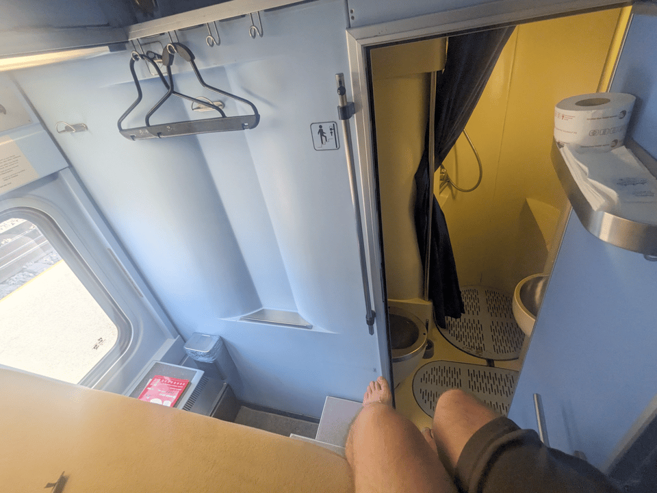 My two bed cabin is nice, but no more spacious than the 2nd class sleeper I had in Uzbekistan. The big change is the somewhat baffling addition of a private bathroom. Really. Every single first class cabin with its own toilet and shower. For now, I have the cabin to myself. There’s lots of space to stash my stuff and get settled in, but my top bunk is not comfortable for sitting, so I go and explore.