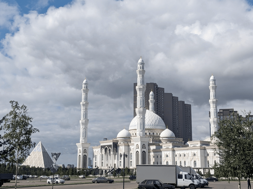 There’s a beautiful, very large white mosque nearby, but I don’t take the opportunity to investigate. In the distance, I can see a large pyramid. All of Astana is like this.