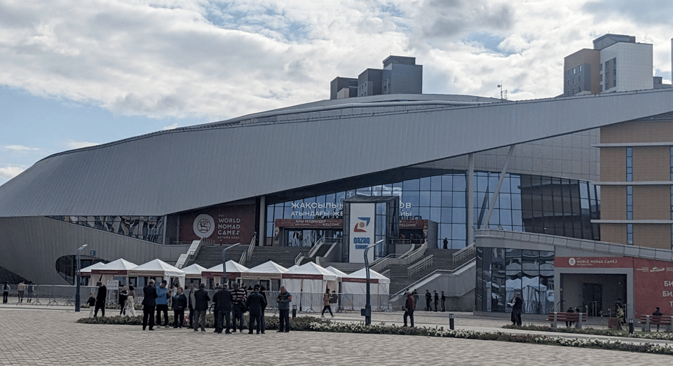 I find another place to stay without mishap, and soon head out to my first event of the Nomad Games: “Mas Wrestling”. Strolling down the boringly wide and straight road, I soon arrive at a vast stadium. Nope, that’s not the Alau Ice Palace, it’s the Martial Arts Palace.