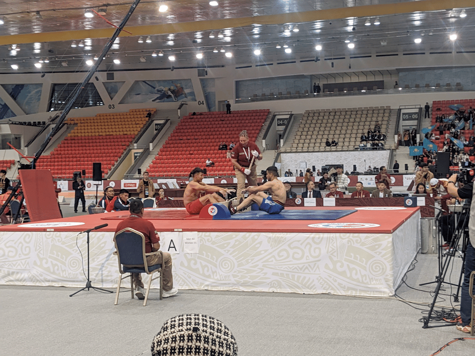 I’m here to see Mas Wrestling, which really isn’t anything like wrestling. It’s played on a platform closely resembling a table tennis table with a wooden plank for a net. The players sit on opposite sides of this plank, bracing their feet against it while they grip a short wooden stick the width of a broom handle.
