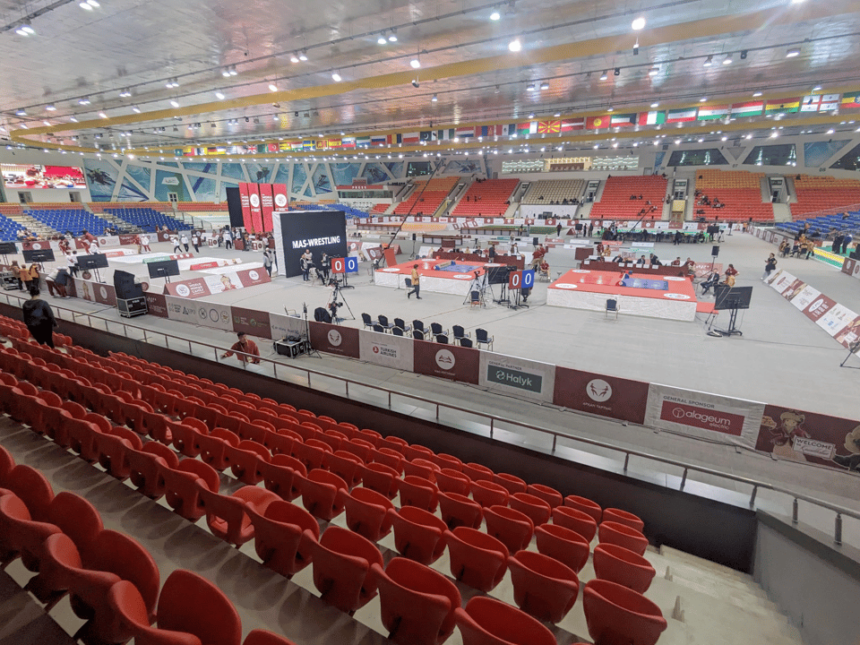 There is also Korash, one of a number of forms of wrestling at the Games. It looks very similar to judo except you’re not allowed to touch the legs, so there’s no tripping. Every match there is one person in blue and one in green. It looks exciting, but hard to see from my distant vantage point.