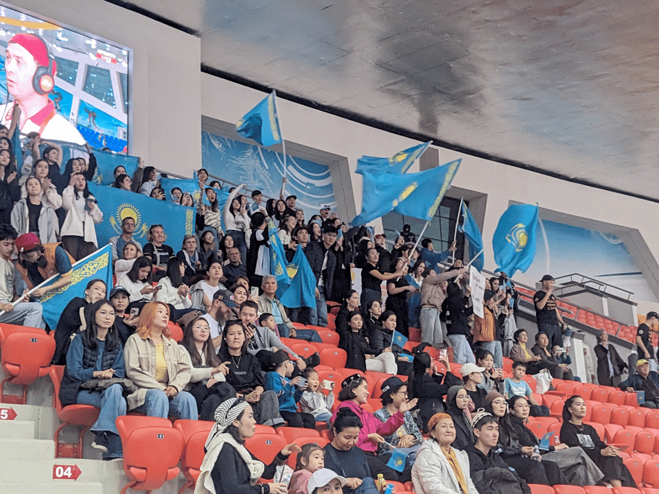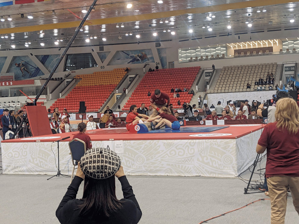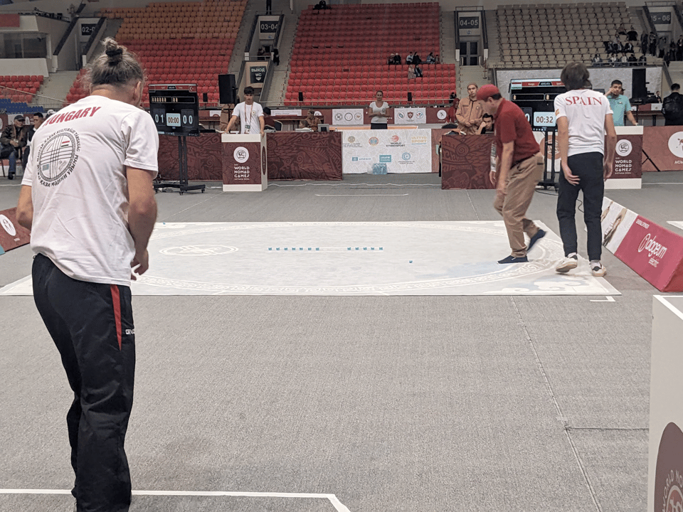 There is Assyk Atu, a game of knucklebones vaguely resembling beer pong both in form and competitor vibe. There’s a big rug, on which a line of knucklebones is arranged. A competitor stands a few metres back behind a line, and throws another knucklebone, hoping to hit. On the very rare occasion they succeed, they then get to move up to the edge of the rug, and keep taking shots until they miss. Otherwise, they run around to find their knucklebone while their opponent at the other end takes their turn, and they swap ends. Mostly they spend their time running from end to end and looking for their knucklebone, which might be under a chair, behind the TV, trapped behind an advertising sign. The whole thing feels very much like something a couple of drunk dudes made up one evening, and is a bit hard to take seriously. It’s not helped by some of the competitors being frankly terrible. I watch the guy from Spain take at least 50 shots in his match against Hungary and not connect a single time.