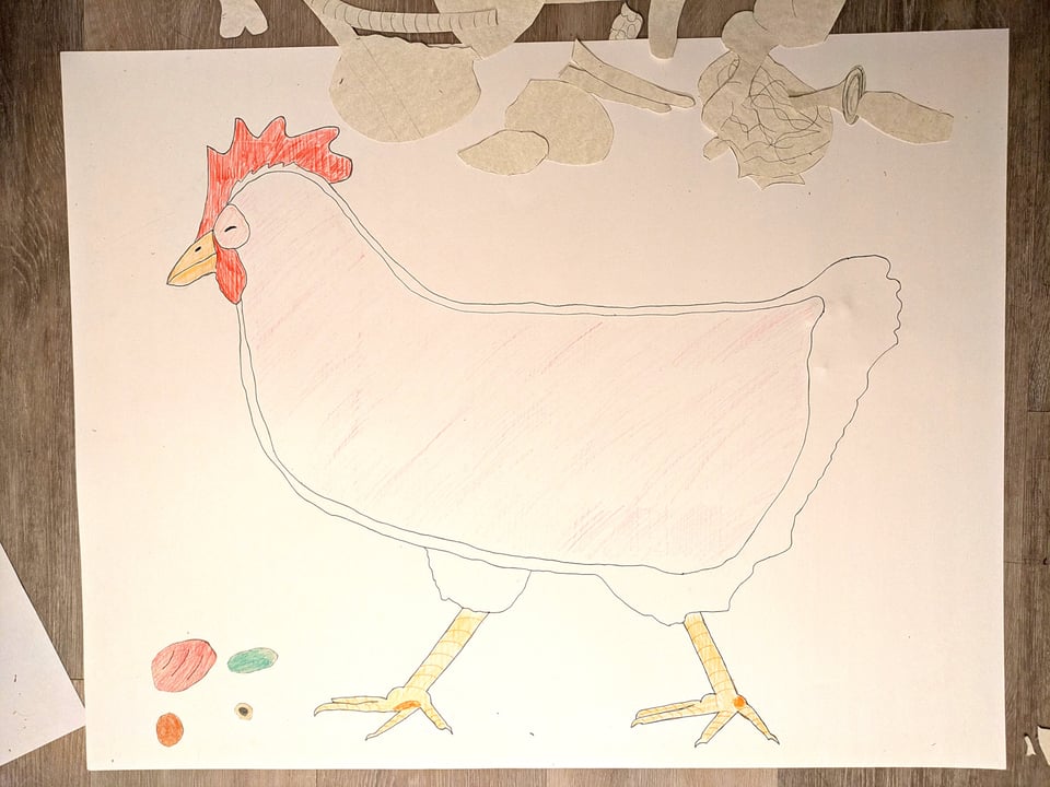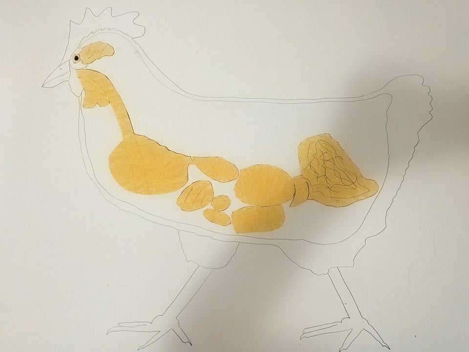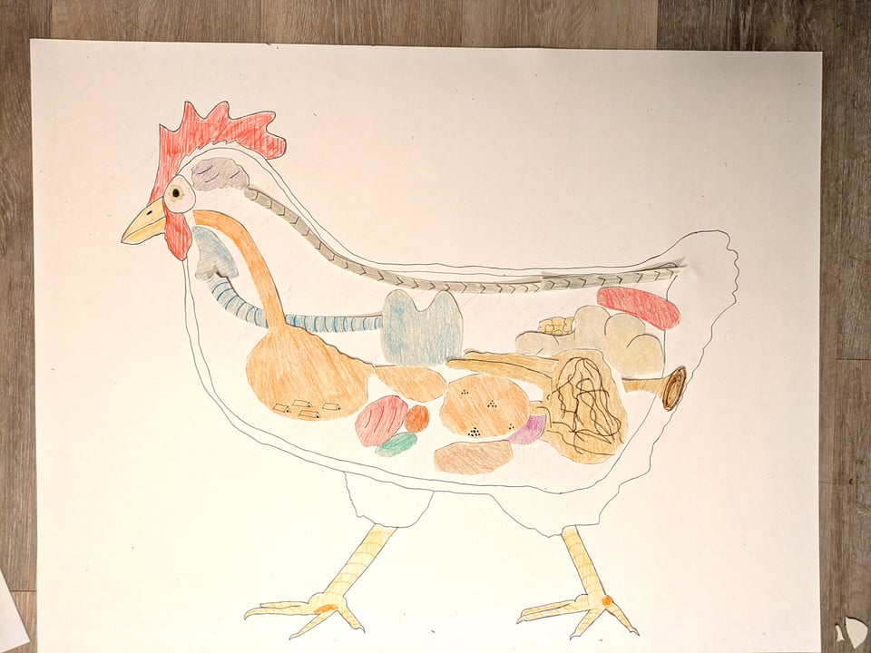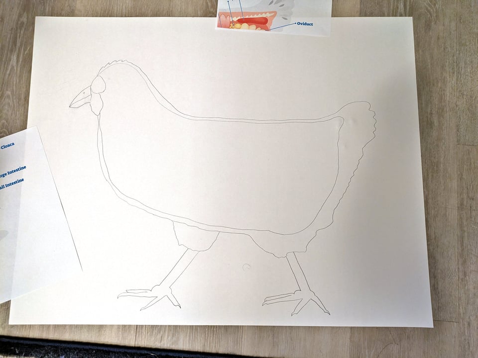 First, I drew the outline of a chicken on a big-old piece of poster paper. (Well, no. Actually, first I did hours of research on chicken anatomy, learning things Mankind Was Not Meant to Know™. Then I drew the chicken.)