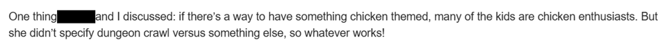 Was it a hit? Reader, after the session, one of my child players (who has been to five of these birthday parties and countless afterschool D&D campaigns) soberly told me that this was the best adventure yet and that I should strongly consider publishing it. When I suggested that normal D&D players might be less interested in chicken-based exploration than he and his friends, he quickly rejoined “how many ‘normal D&D players’ do you know?” Touché, kid. Touché.