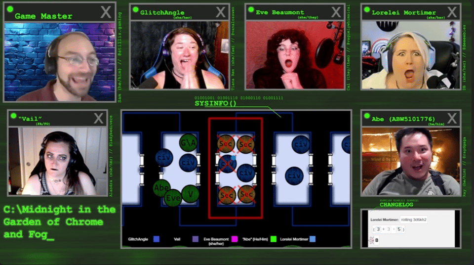 The second, pictured below, is Midnight in the Garden of Chrome and Fog, a cyberpunk campaign I wrote and ran for the RPG Cities Without Number. This one’s 16 sessions, and while it starts off looking like it’s going to be heist-of-the-week, it quickly deepens as the characters find themselves drawn into a conspiracy decades in the making. You can find the whole youtube playlist here.
