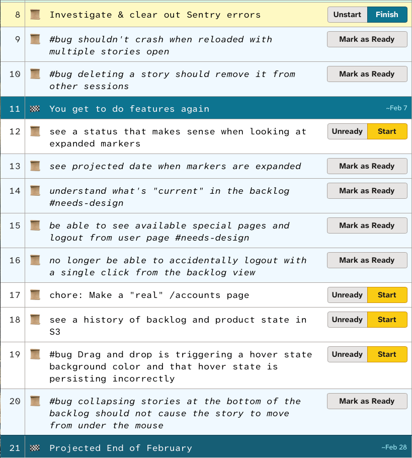 The biggest piece of work there is “understand what’s ‘current’ in the backlog.’” What we’re trying to do here is make the backlog more comprehensible “at a glance” to someone who was used to reading Tracker backlog status. (This is something that, bafflingly, no project tracking software we’re aware of delivers. They all either make the story cards themselves so large that you can’t see everything a team is working on at once, or make projects so customizable that you can’t understand a project without understanding the details of how that particular project works. These tools tend to assume that outside stakeholders want to view projects via statistics, which can often only answer questions you thought to ask in advance.)