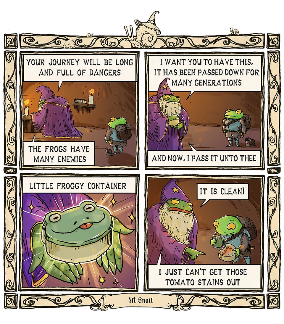 You can support ‘M Snail Art’ creating a story about wizards frogs and a tower on Patreon or follow on Instagram.