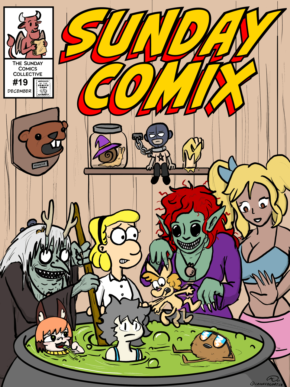 This issue’s cover is another killer cross-over of Sunday Comix characters, this time by Brandon Weigel, creator of ‘Love & Hex’. Poor Maurice…