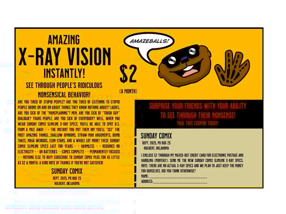 Sunday Comix is available for FREE to all of you. But for those of you who want to contribute further to Sunday Comix, you can pay $2 a month for our bonus features. Those bonus features will take many forms. They could be exclusive comics, interviews, videos, process tutorials…you name it!