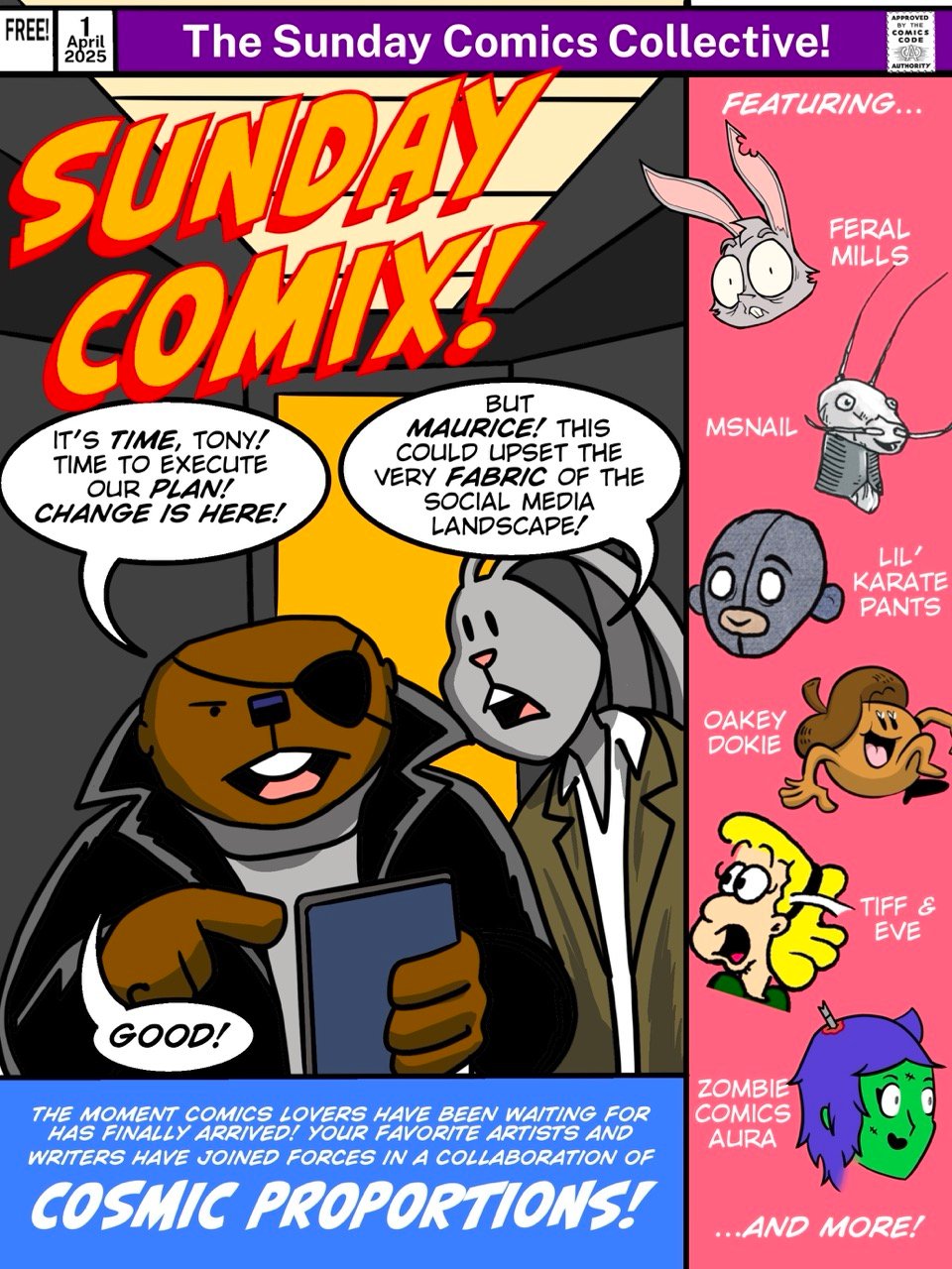 Sunday Comix is made by us. And we are part of the Sunday Comics Collective. We are a group of artists that are a union of creators. We will publish our books our way and we will push those books directly to you.