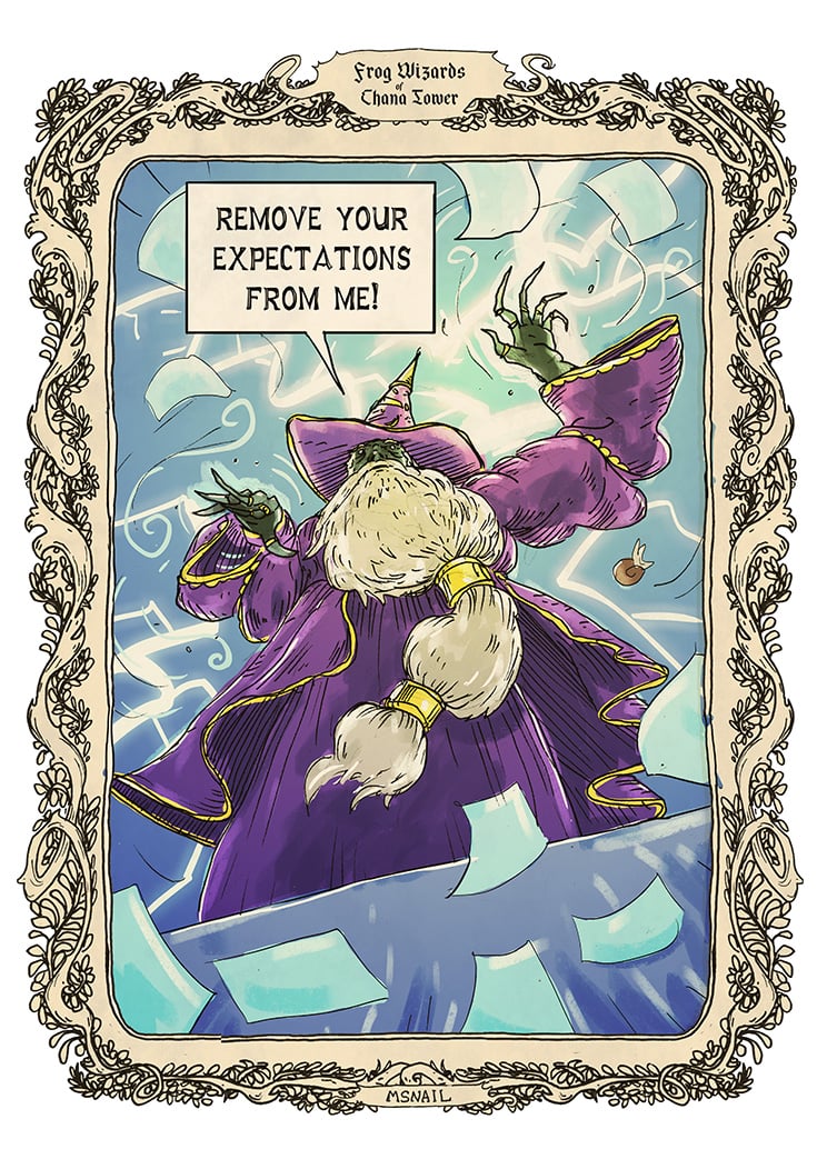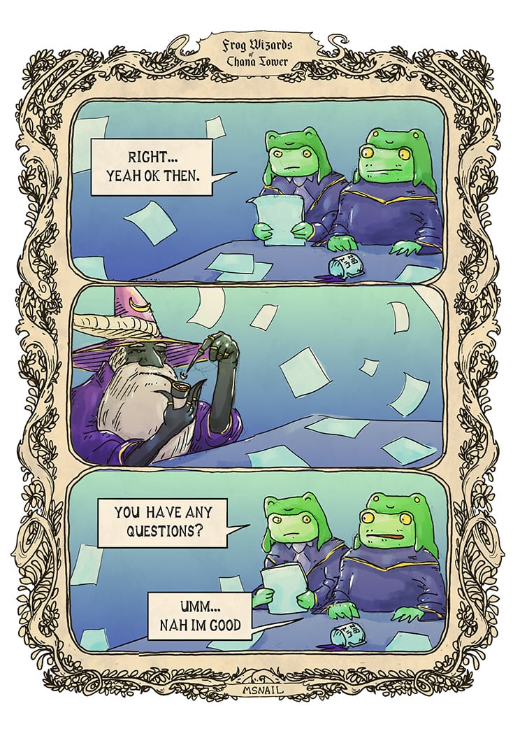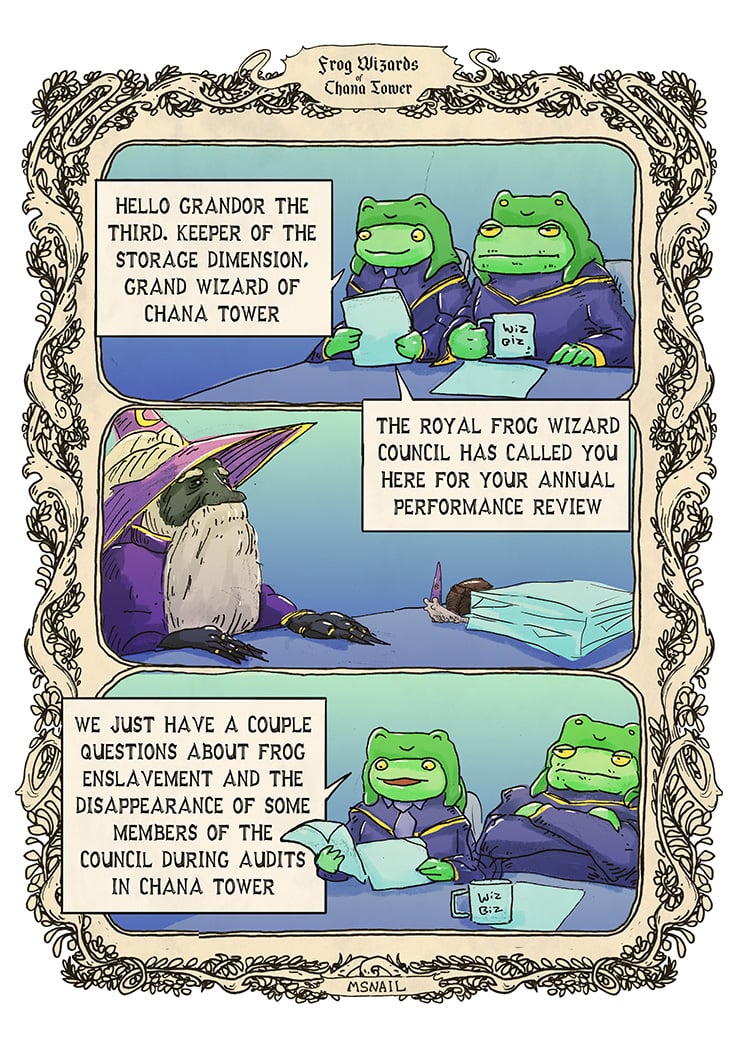 You can support ‘M Snail Art’ creating a story about wizards frogs and a tower on Patreon or follow on Instagram.