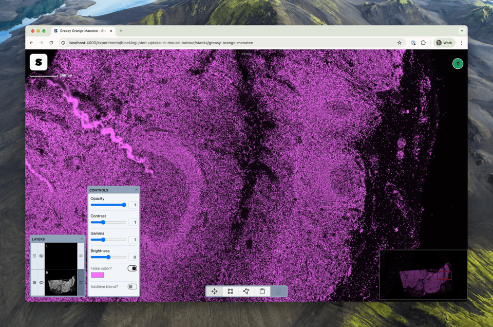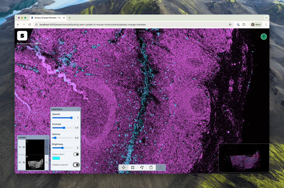 Or, to use a real world use-case from one of our advisors: you could take an image, overlay the visual output of different cell segmentation programs, toggling between them, or using false color to highlight the differences between each modeloth, and discussing those results with your lab colleagues: all in your browser, in realtime.