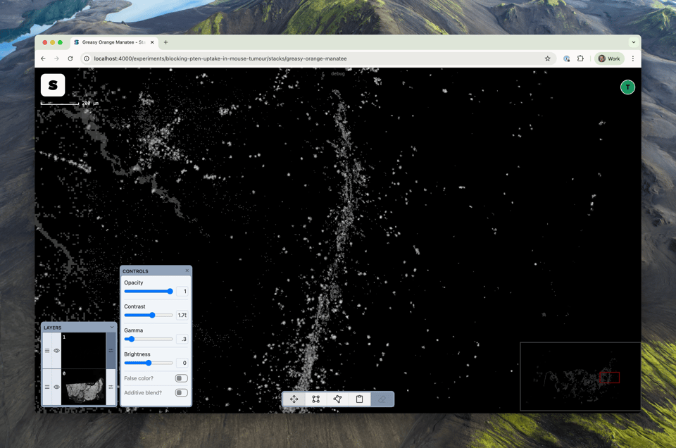 For instance: here’s our mouse tumour stack, with the two layers: one showing the DAPI stain on the bottom, and one showing the CD15 biomarker on the top.