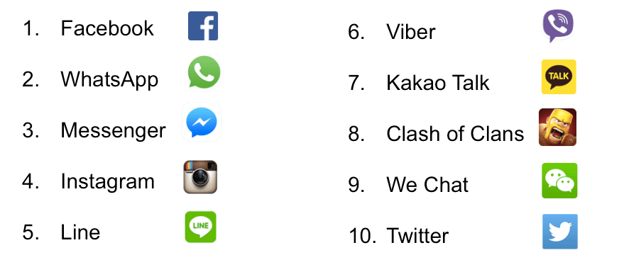 Here are the top 10 most used apps in the world. Notice how the first four are owned by Facebook. [Mary Meeker]
