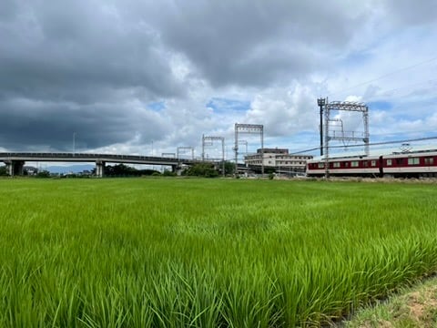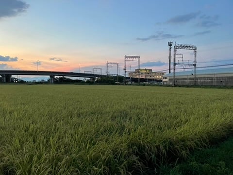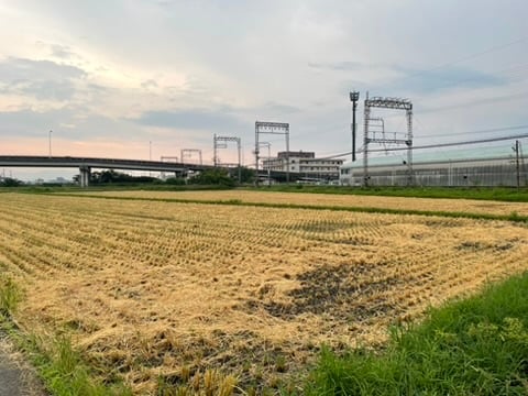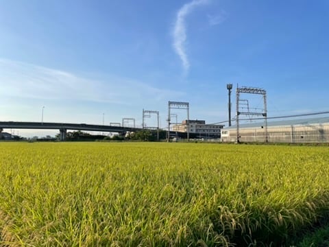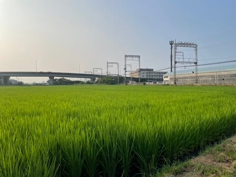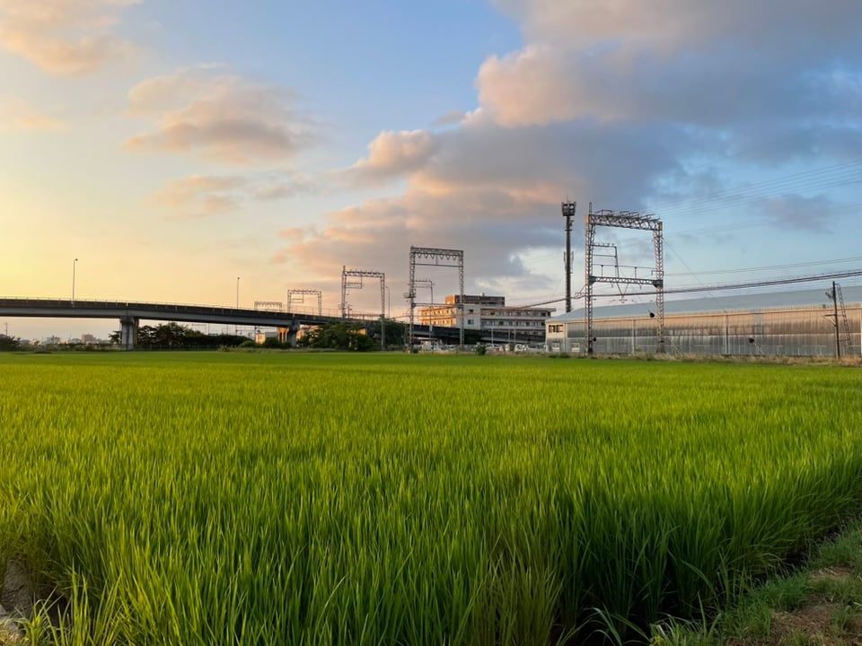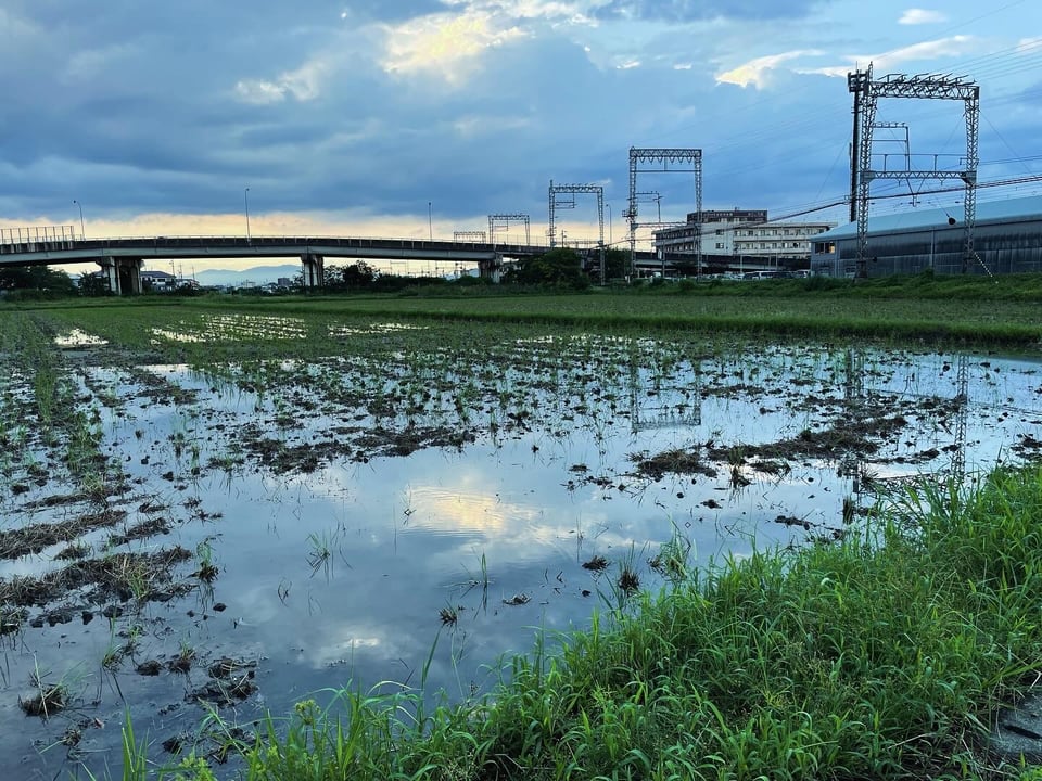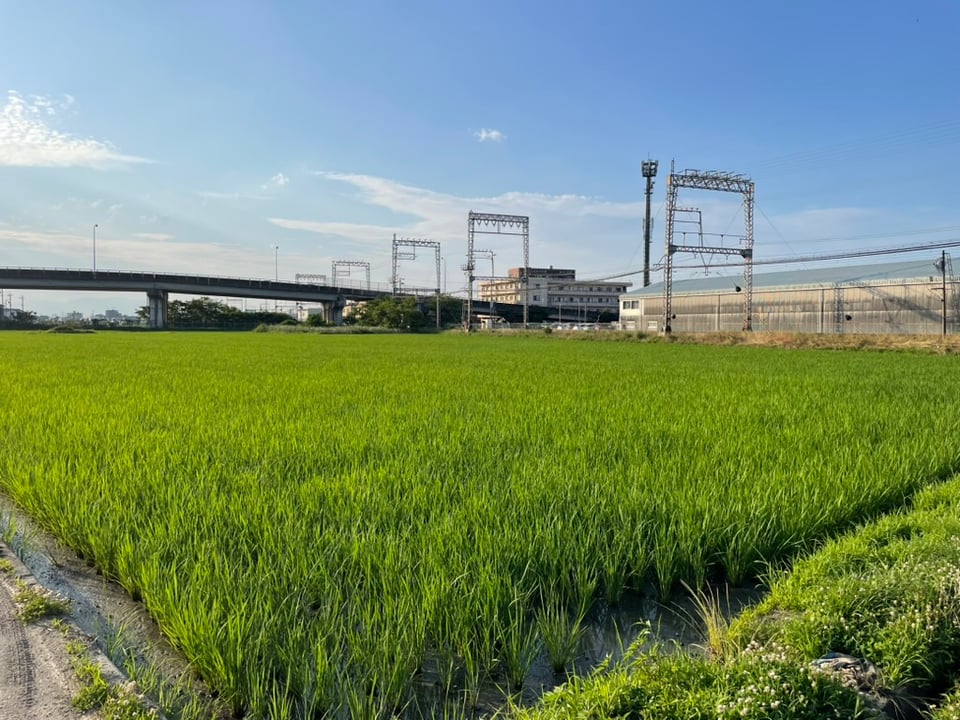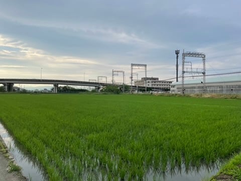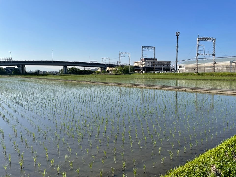 I was down to the wire, like usual, stand-up pedaling to rage across the tracks and make it to the office with a new PR. I discovered the once barren rice paddy freshly weeded, watered, and fertilized for spring. I thought, I want to take its picture. I did, on the way home, without a train holding me hostage.