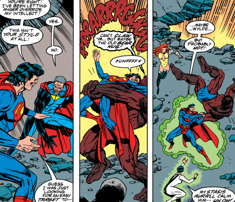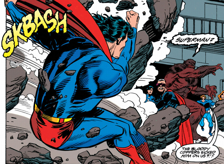 So, Superman tracks down the Eradicator and his Outsiders to their new hideout: an abandoned government facility at Area 51, which the Eradicator knew about due to his old job as a xenobiologist at S.T.A.R. Labs. Superman and the Eradicator immediately start beating the crap out of each other while the Outsiders debate whether they should help their teammate or not, with the consensus being "meh."