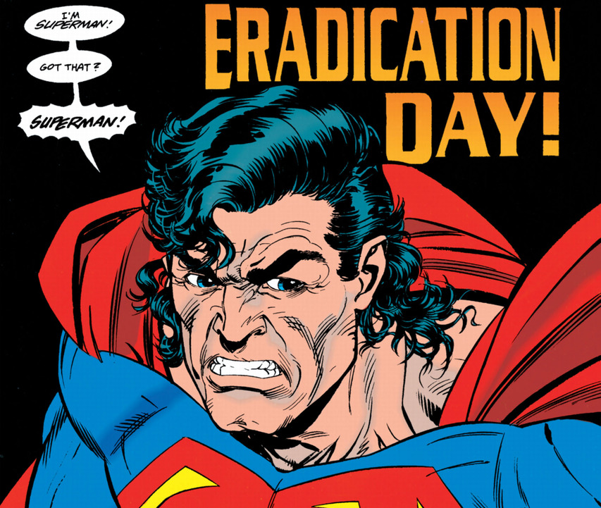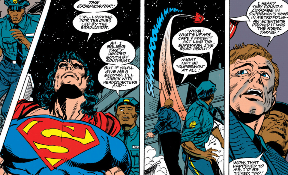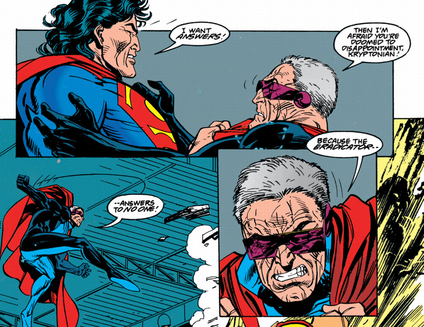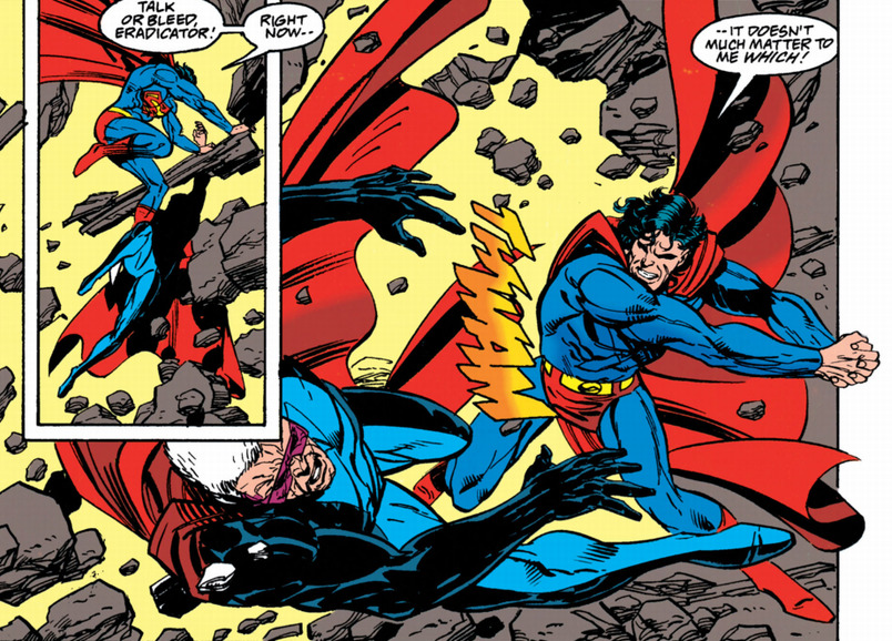 The Eradicator causes a huge explosion and thinks that took care of Superman, because he's never read a Superman comic before -- but no, that just pissed him off even more. Superman is so angry, in fact, that he even tortures the Eradicator by knocking off his protective eyewear and shooting heat vision right at his eyes ("I-It... tickles!" the Eradicator says, which must have sounded very funny in his Clint Eastwood-esque growl).
