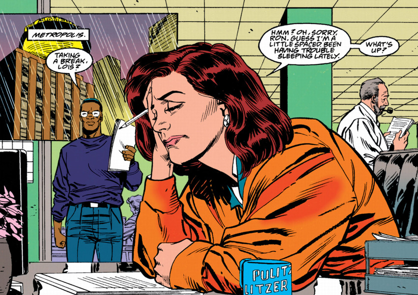 Even Lois Lane isn't sure about Clark, to the point that she's having trouble sleeping and forgets to use the spell-check program at work, causing a crisis in the Daily Planet proofreading department ("There's only one 'R' in 'entrails,'" Ron Troupe tells her). At least her cat Elroy seems in a good mood, probably because he thinks Clark is dead again and he always hated that guy.