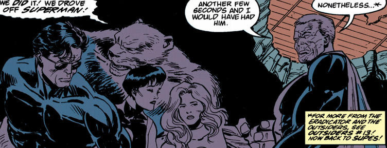 "DEAD AGAIN!," Part 4! Superman vs. the Eradicator! With the Outsiders mostly just sorta standing around, commentating on the fight but staying out of it. That's why they're called the Outsiders.