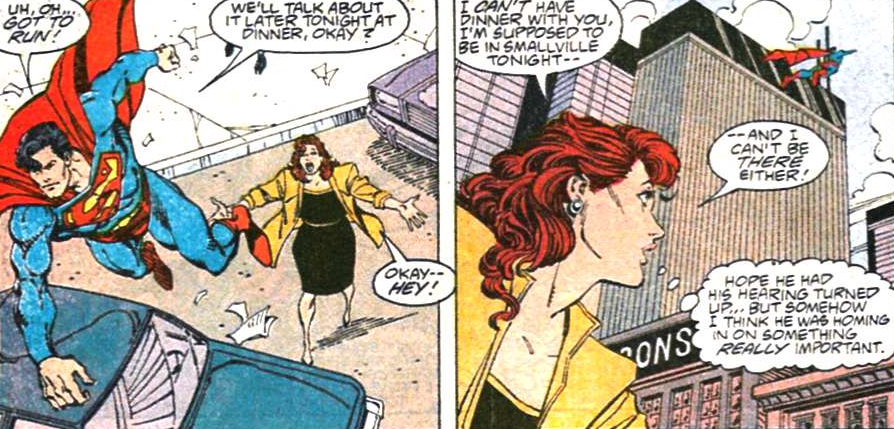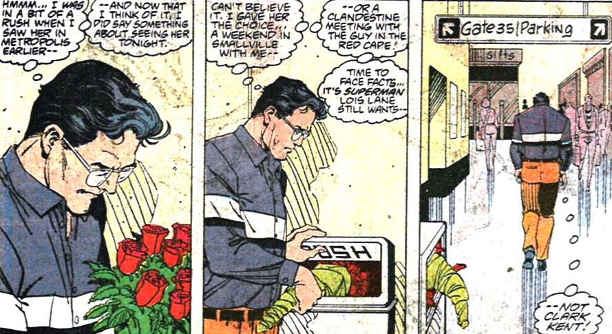 Most people would have cracked the mystery of Superman’s secret identity right there, but this being Lois Lane, she just thinks Superman is inviting her to dinner too (we’ll find out what’s keeping Lois busy in the next issue of Action). And of course, when Lois doesn’t show up at the airport in the end, Clark thinks she chose Superman over him and Charlie Browns away.