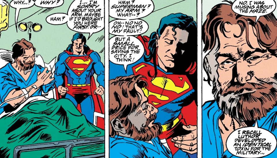 Am I alone in being confused why the toxin was able to affect Superman’s super-efficient system? Though he needs to breathe, traditionally, he’d never show much vulnerability to gases in past stories. [Max: I guess it's possible that Lex intentionally designed it to be strong enough to affect Superman, and the military rejected it when they were like "uh, why does the budget include a $100 million 'Kryptonian respiratory system research' item...?"]