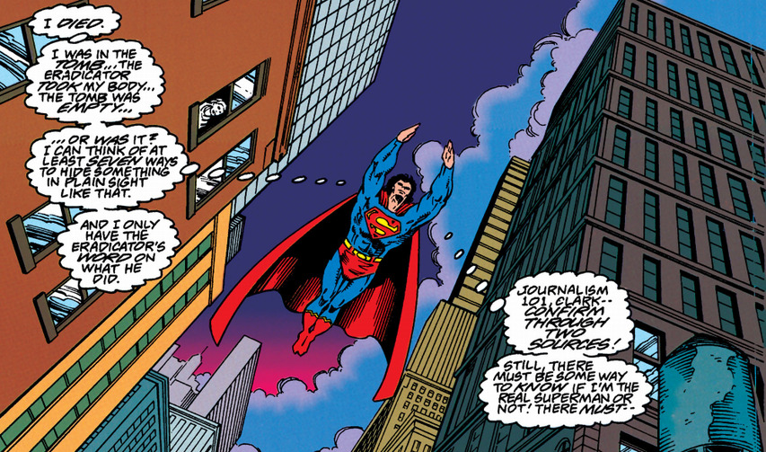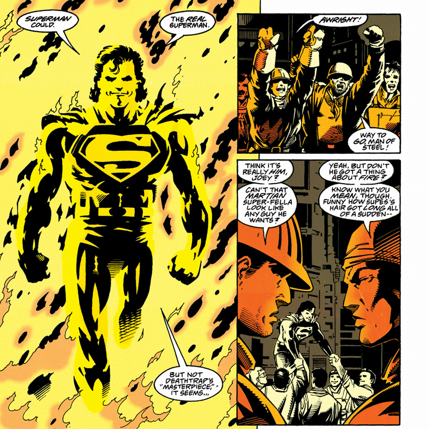Before being derailed by Deathtrap, Superman recaps the events of his resurrection: first he died (a common prerequisite for being resurrected), then his corpse was placed in a cozy tomb, and then the Eradicator took it from that tomb and brought it to the Fortress of Solitude (as told in Action #690). However, Superman only has the Eradicator's word that this is what happened, and that guy hasn't always been the most trustworthy. This is a teaser for a crossover happening in the next issue of Action.