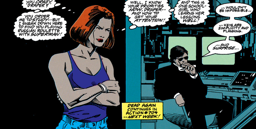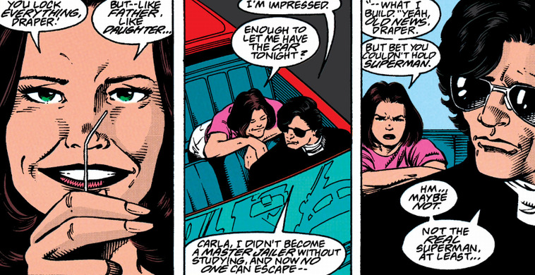 Draper overhears Lois Lane and Jimmy Olsen talking about how Superman might not be Superman, which, combined with his teenage daughter telling him he couldn't build a prison to hold an authentic Kryptonian, gives him an idea for a little side project: he's gonna find out if this is the Real Steel Deal by making a trap only Superman could escape from. Naturally, this involves creating a supervillain persona for himself, the aforementioned Deathtrap.