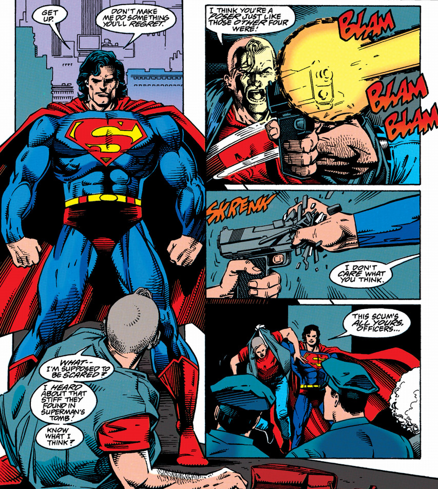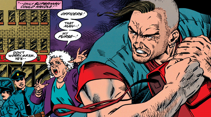 Last week in Superman #94, Professor Hamilton finished analyzing the corpse that was found in Superman's supposedly empty tomb and determined that it is, in fact, the real Superman. So who's the other guy? You know, the one who's alive and also uses more shampoo than Superman used to? The living "Superman" (if that's even his real name) agrees to be examined by Hamilton too, but he has to put that off when an emergency comes up: an old lady had her purse snatched!!! Right in front of some cops, too.