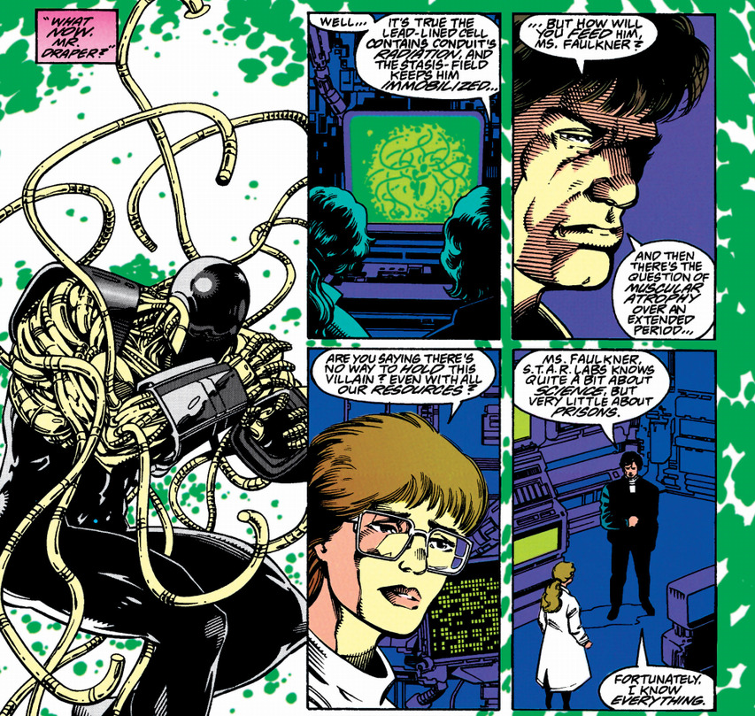 Back at S.T.A.R., the scientists not currently occupied analyzing super-buff corpses have called a specialist called Carl Draper to build a new cell for the villain Conduit (who has appeared in seven issues in a row as of this one, so they should really start giving him co-star billing). As a reminder, they need a new cell because Conduit broke out of the last one when someone pissed him off during lunchtime.