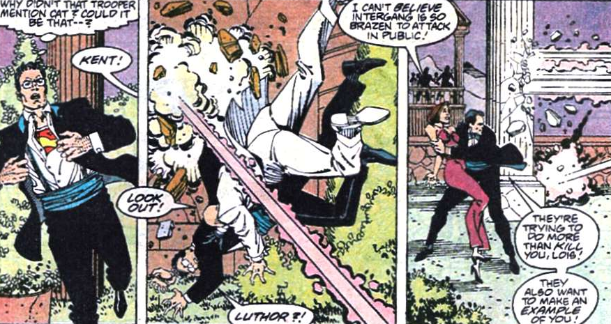 Luthor insists that he shall repay the favor – and he gets a chance on the very next page, when Intergang troopers invade the ceremony and try to kill Clark. The surprisingly spry Lex actually leaps in the air to “save” Clark from a blast that, to be fair, would have totally ruined his fancy dinner suit, not to mention secret identity.