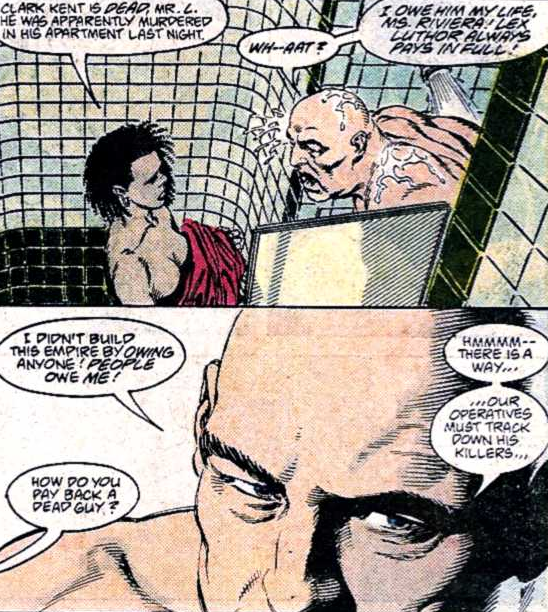 UPDATE: I WAS WRONG! Adam Mallinger pointed out on BlueSky that Lex found on in Adventures #451, when Superman was in Exile and Clark was believed dead. Lex is disturbed by the news – not because he cared for Clark but because he needs to repay his debt, so he decides to make up for it by going after Clark’s “killers” at Intergang. Oh, and all of this happens while Lex is in the shower.